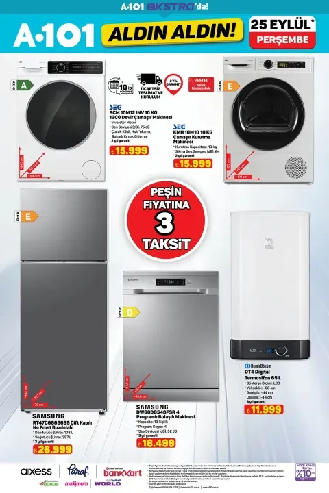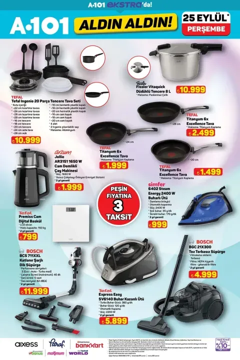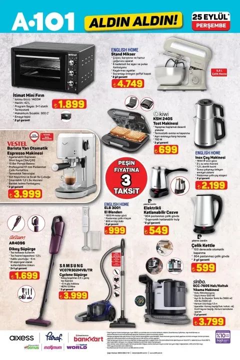 25 Eylül A101 ürünleri arasında bu hafta öne çıkanlar ise oldukça dikkat çekici: Stand mikser, mini fırın, yarı otomatik espresso makinesi, dikey süpürge ve çelik kettle ilk sırada yer alıyor. Ayrıca tost makinesi, çay makinesi, elektrikli cezve, evcil hayvan ürünleri ve motosiklet gibi farklı kategorilerde birçok ürün de katalogda bulunuyor.