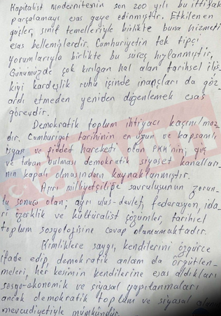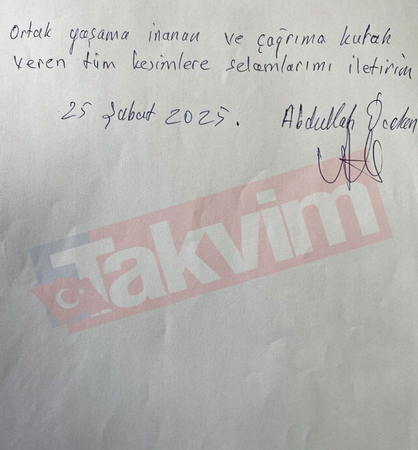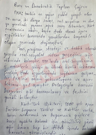 Terör örgütü PKK’nın elebaşı Abdullah Öcalan tarafından kaleme alınan ve silah bırakma çağrısını içeren mektup kamuoyuyla paylaşıldı.