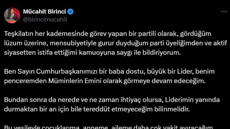 Kararı internet sitelerinden öğrendiğini belirten Avukat Mücahit Birinci, “Sayın Cumhurbaşkanımızı rahatlatmak için partimden direkt istifa ederim” dedi.