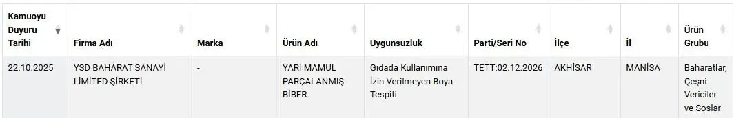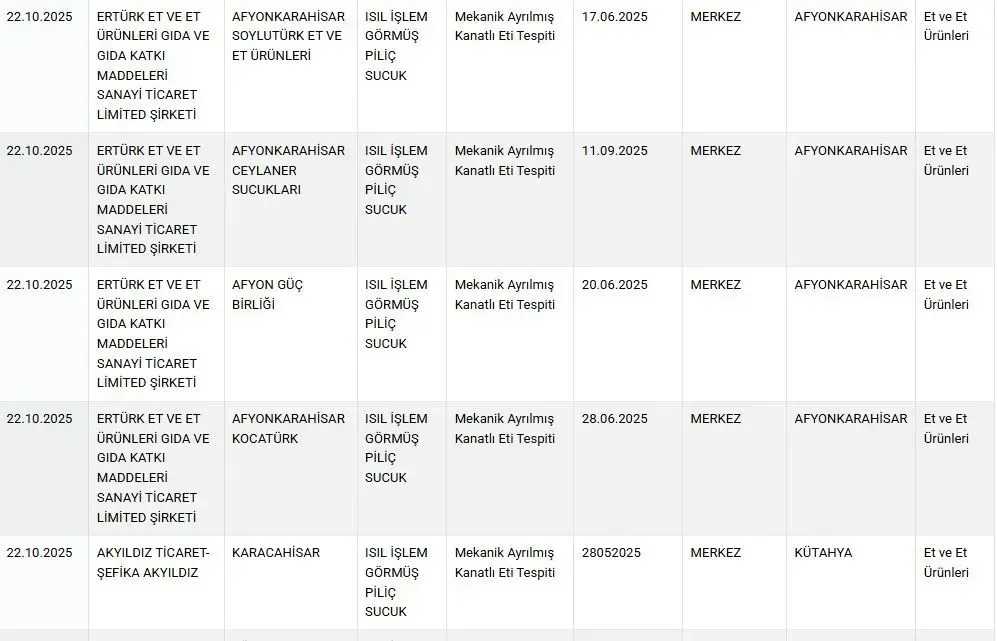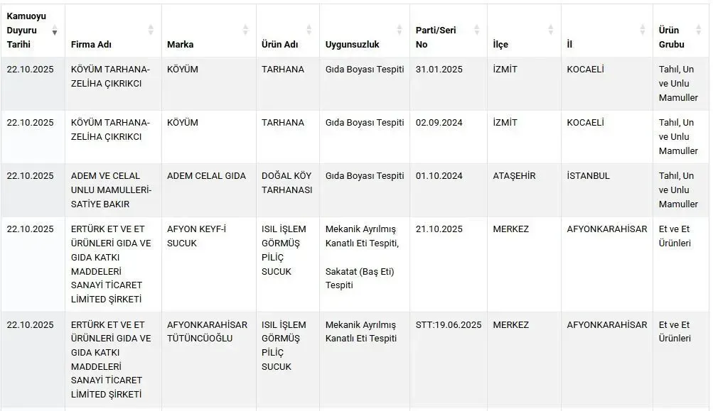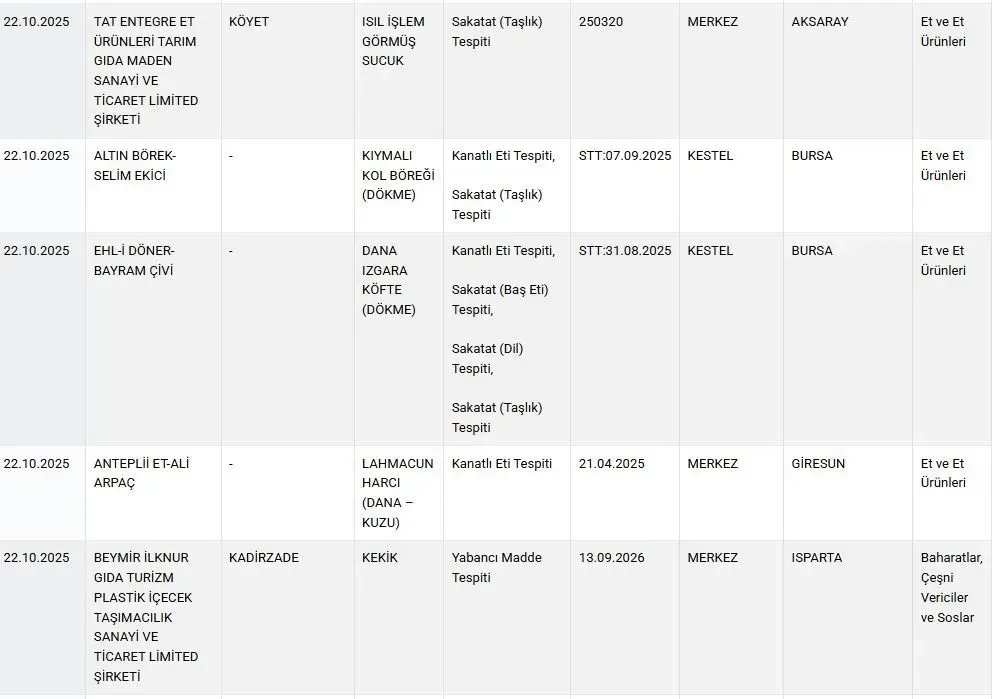Vatandaşların sağlıklı gıdaya erişmesi için Tarım ve Orman Bakanlığı yaptığı denetimler sonrası uygunsuz olan ürünleri ifşa etmeye devam ediyor.Zaman zaman güncellenen ve yenileri eklenen uygunsuz ürünler listesine yeni markalar ve ürünler girdi.Son yapılan testlerde; dana köfte, kıymalı börek ve sucuk yapımında sakatat, baharatta yasaklı boya, tarhanada ise gıda boyası kullanımı tespit edildi.