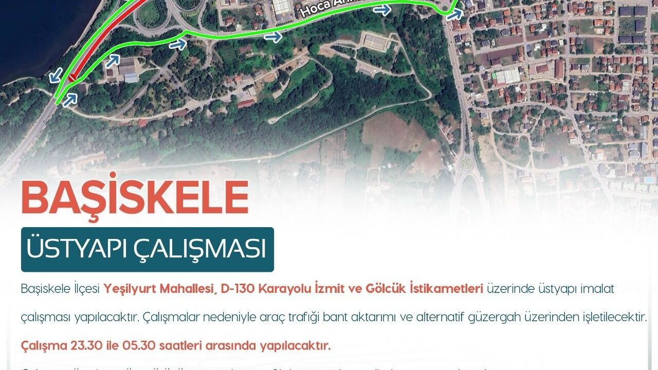 Ulaşım Daire Başkanlığı ekipleri tarafından Başiskele Yeşilyurt Mahallesi’nde yürütülecek çalışmalar kapsamında, D-130 Karayolu’nun İzmit ve Gölcük istikametlerinde üstyapı imalatı yapılacak. Çalışmaların gece saatlerinde planlandığı ifade edildi.