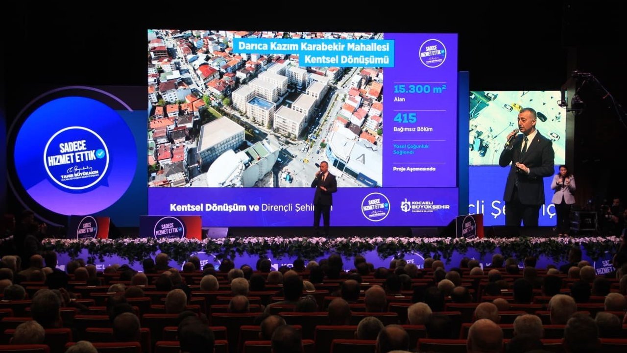 Kocaeli Büyükşehir Belediye Başkanı Tahir Büyükakın, “Sadece hizmet ettik” başlığıyla Kocaeli Kongre Merkezi’nde düzenlenen toplantıda son iki yıllık çalışmalarını aktarırken kentsel dönüşüm projelerine özel başlık açtı. Programa çok sayıda siyasetçi, oda temsilcisi ve davetli katıldı.