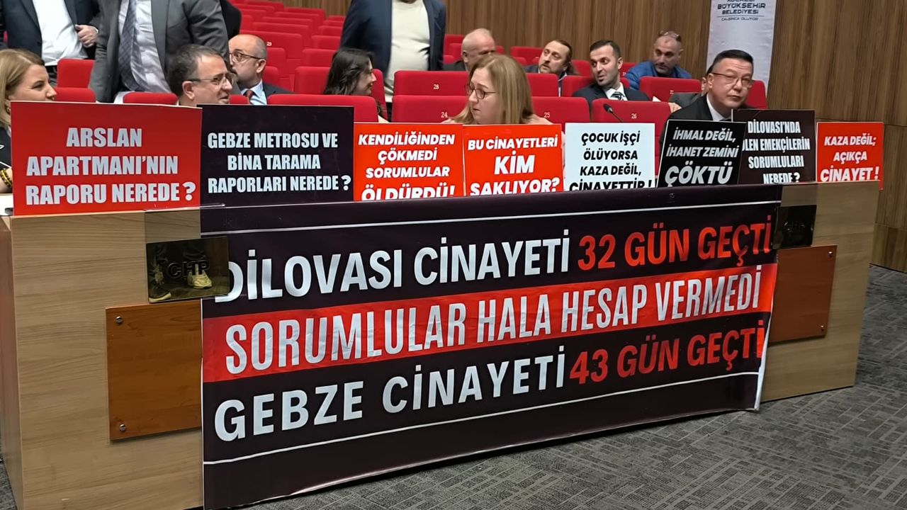 CHP’li üyeler, üzerinde “Arslan Apartmanının raporu nerede?”, “Gebze metrosu ve bina tarama raporları nerede?”, “Kendiliğinden çökmedi; sorumlular öldürdü.”, “Bu cinayetleri kim saklıyor?”, “Çocuk işçi ölüyorsa kaza değil, cinayettir.” gibi ifadelerin yer aldığı dikkat çekici dövizlerle de tepkilerini güçlendirdi.