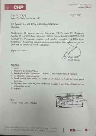 Genel Başkan Özgür Özel imzasıyla Çankaya İlçe Seçim Kurulu'na 900'ün üzerinde delegenin imzasıyla yapılan başvuruya göre Kurultay 21 Eylül Pazar günü mevcut yönetim hakkında güven oylaması ve Genel Başkan ile PM seçimleri gündemiyle toplanacak.