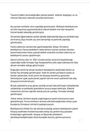 Üniversite öğrencilerine verilen destek ödemesinde başvuru kriterleri baz alınmamış olup öncelik soy isim benzerliği ve particilik yapıldığı görülmüştür. Fatura ödemesi zamanında yapılmadığından dolayı, firmaların belediyemizi fatura bedellerini talep etmesi üzerine açtıkları davaları kazanmalarından ötürü, yüksek bedelli avukatlık ücretleri ödenmiş ve belediyemiz zarara uğratılmıştır.