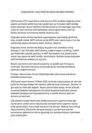 CHP Körfez Belediye Meclis Üyesi ve Denetim Komisyon Üyesi Erkan Uygun Körfez Belediyesinin denetim raporuna CHP grubu olarak verdikleri şerh raporunu açıkladı. Meclis toplantısında konuşan Erkan Uygun şerh gerekçelerini sıraladığı açıklamasında şu ifadeleri kullandı; “2024 yılında 4737 sayılı Kamu ihale Kanunu 22D maddesi doğrultusunda yapılan alımlarda sektör bazında sürekli aynı üç firmadan teklif alındığı tespit edilmiştir. Bu tür tekliflerin Körfez esnaf ve firmalarından açık ihale usulü ile satın alınması hem belediyeyi zarara uğratmamış, hem de Körfez esnafına ve firmasına destek olunmuş olur.