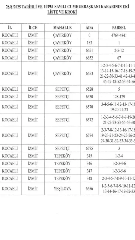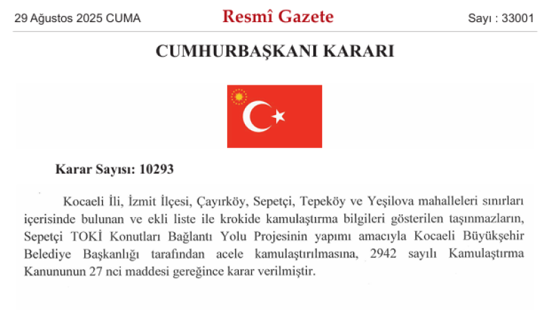 Kocaeli’de bazı taşınmazların kamulaştırılmasına dair Cumhurbaşkanı kararları T.C. Resmî Gazete’de yayımlandı. Karara göre İzmit’in Çayırköy, Sepetçi, Tepeköy ve Yeşilova mahallelerinde bulunan taşınmazlar, Sepetçi TOKİ Konutları Bağlantı Yolu Projesi kapsamında Kocaeli Büyükşehir Belediyesi tarafından acele kamulaştırılacak. Kamulaştırma yapılacak bölgeler şunlar: