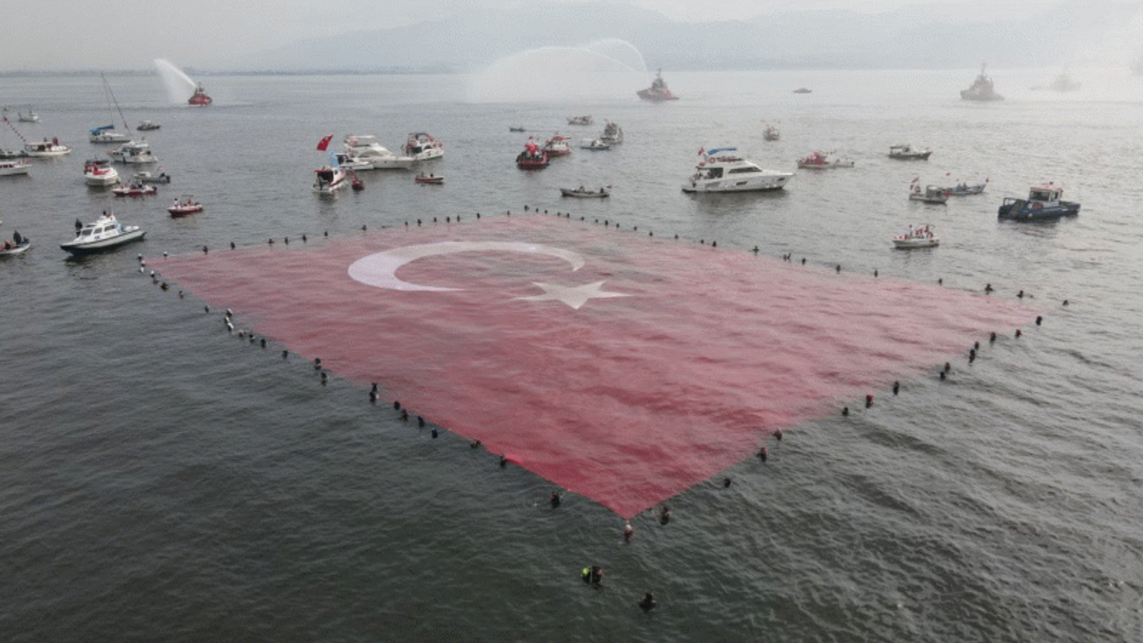 Vali Yavuz ardından konuşan Kocaeli Büyükşehir Belediye Başkanı Tahir Büyükakın ise, “Bugün farklı bir etkinlik yapıldı, en büyük bayrağın açılması etkinliğiydi. 1923 metrekare bayrağımızın büyüklüğü ve onu denizde açmak son derece zor. Ben bu etkinliğe öncelik eden dalgıç arkadaşlarımızı tebrik ediyorum. Cumhuriyetimizin 100. Yılı açısından son derece anlamlı bir hediye vermiş oldular. Üzerinde deniz suyunun ağırlığı gerçekten çok etkili oluyor ama uzunca bir süre o performansı gösterdiler. Kendilerine sonsuz teşekkür ediyorum. Yeni yüzyılda da Türkiye’nin aynı kararlılıkla yükseleceğinin bunlar ayak sesleri değil bizzat kendisidir. Ben bu coşkuya katılan tüm vatandaşlarımızı tebrik ediyorum. Başta Mustafa Kemal Atatürk ve silah arkadaşlarına saygı ve minnet duyuyorum” şeklinde konuştu.