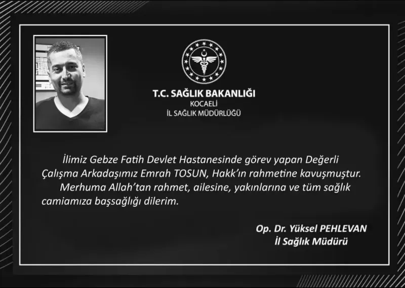 Kocaeli İl Sağlık Müdürlüğü, sosyal medya hesabından yaptığı paylaşımda Tosun’un vefatını duyurarak başsağlığı mesajı yayımladı. Paylaşımda, “İlimiz Gebze Fatih Devlet Hastanesi’nde görev yapan değerli çalışma arkadaşımız Emrah Tosun, Hakk’ın rahmetine kavuşmuştur. Merhuma Allah’tan rahmet, ailesine, yakınlarına ve tüm sağlık camiamıza başsağlığı dileriz” ifadelerine yer verildi. Aslen Tokatlı olan Emrah Tosun’un cenazesinin bugün İstanbul Pendik’te kılınacak cenaze namazının ardından defnedileceği öğrenildi.