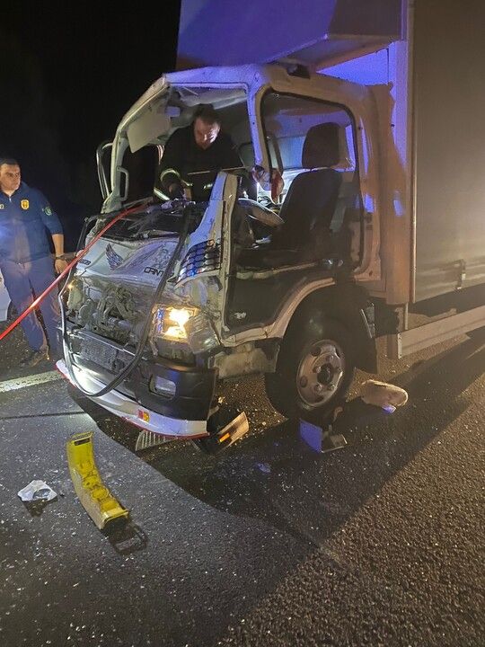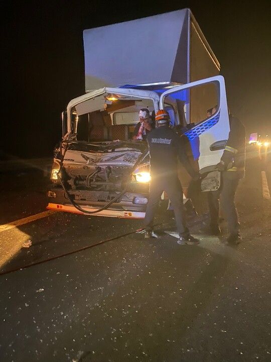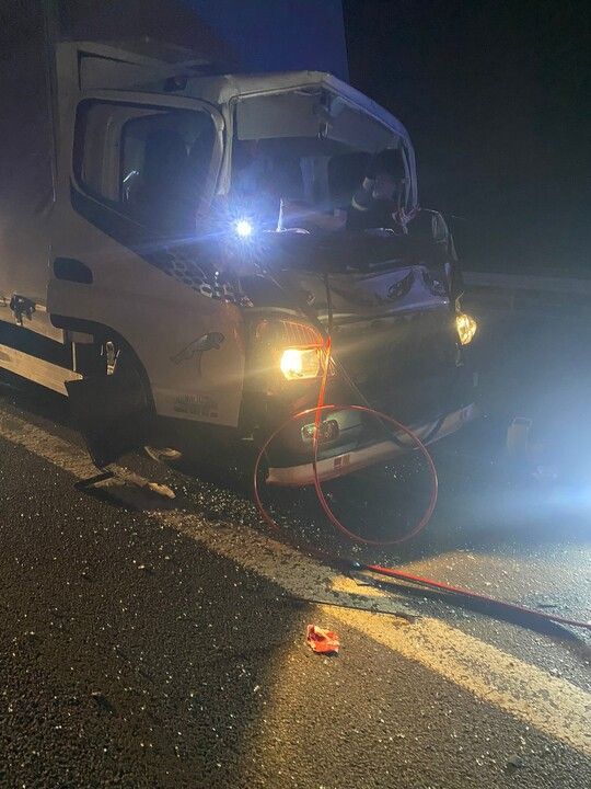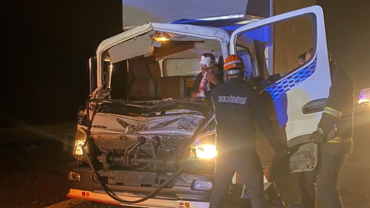 Bolu TEM Otoyolu'nda kamyon ile çarpışan kamyonet sürücüsü, araç kabininde sıkışarak yaralandı.