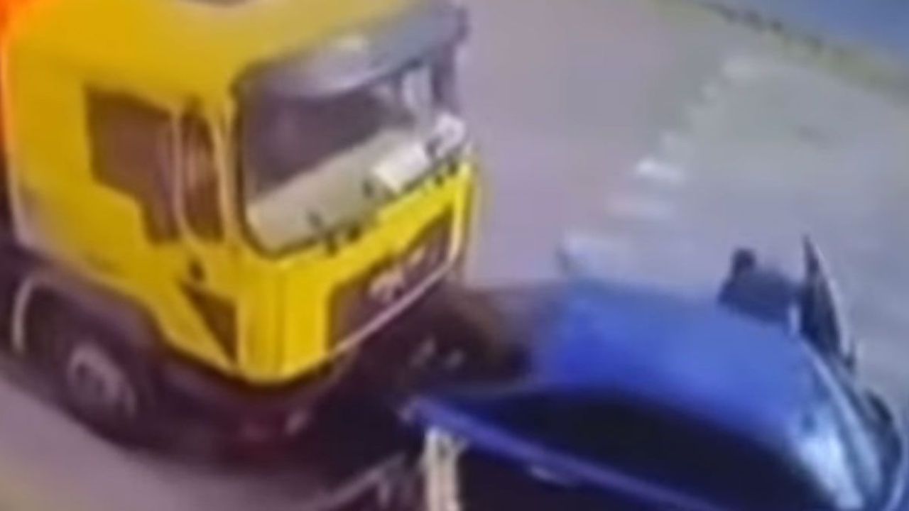 Hareket eden tır, önünde park halinde bulunan otomobile çarptı. Çarpmanın etkisiyle otomobil, öndeki başka bir tıra sıkıştı. İki dev araç arasında kalan otomobil adeta ezildi ve kullanılamaz hale geldi.