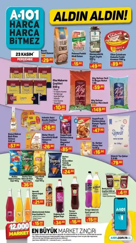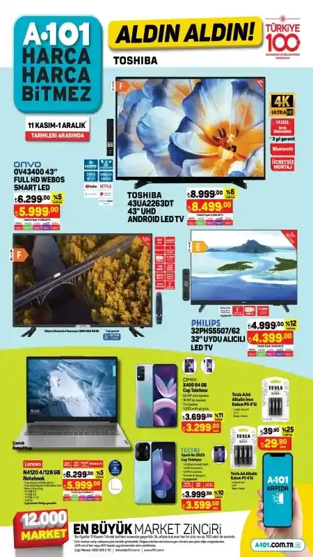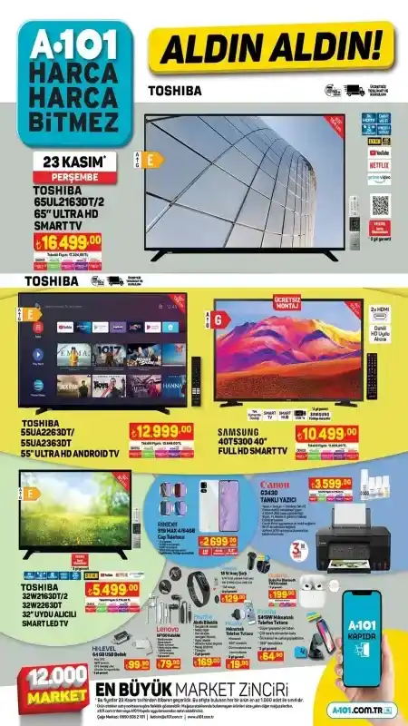 Her Perşembe günü güncellenen A101 Aktüel Ürünler Listesi, çeşitli kategorilerdeki ürünleri kapsamlı indirimlerle sunuyor. Gıdadan elektroniğe, ev eşyalarından kişisel bakım ürünlerine kadar geniş bir yelpazede sunulan bu indirimler, tüketicilerin büyük ilgisini çekiyor. Özellikle internet üzerinden sıklıkla yapılan "A101 aktüel ürünler kataloğu" aramaları, bu listeye olan yoğun ilgiyi gösteriyor. 23 Kasım Perşembe günü yayınlanan liste, yine birçok cazip teklifi beraberinde getirirken A101 müşterilerinin yüzünü güldürmeye devam ediyor. Bu hafta A101'de öne çıkan indirimlerde Toshiba marka 65 inç akıllı televizyon, sadece 16.499 TL'ye sunuluyor. Ayrıca, beyaz eşya ve telefonlarda da büyük indirimler sizleri bekliyor! İşte A101 23 Kasım 2023 Kataloğu...