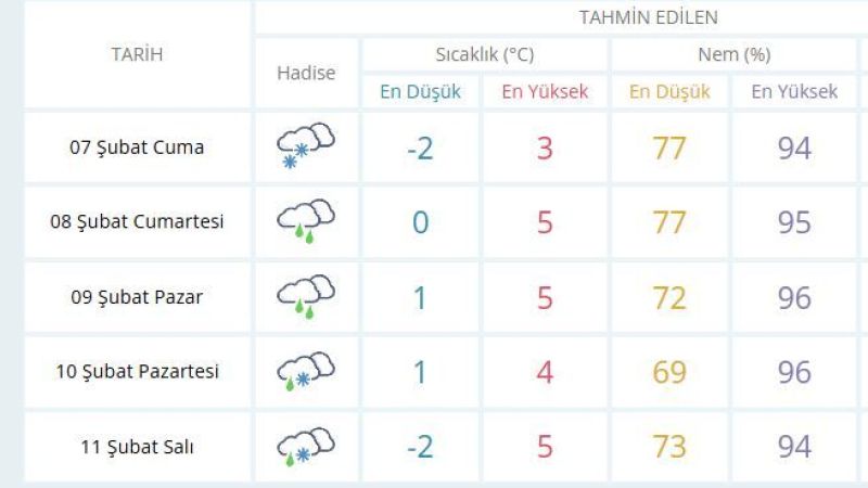 Meteoroloji Genel Müdürlüğü tarafından yayınlanan Kocaeli hava durumu verilerine göre hava sıcaklıkları hafta sonu 2-3 derece artacak. Sıcaklıkların sıfırın üstüne çıkmasıyla birlikte kent genelinde yağmur etkisini göstermesi beklenirken pazartesi günü itibarıyla tekrar kar ve karla karışık yağmurun etkili olması bekleniyor. Kocaeli 5 günlük hava durumu resimli tablosu ise şu şekilde;