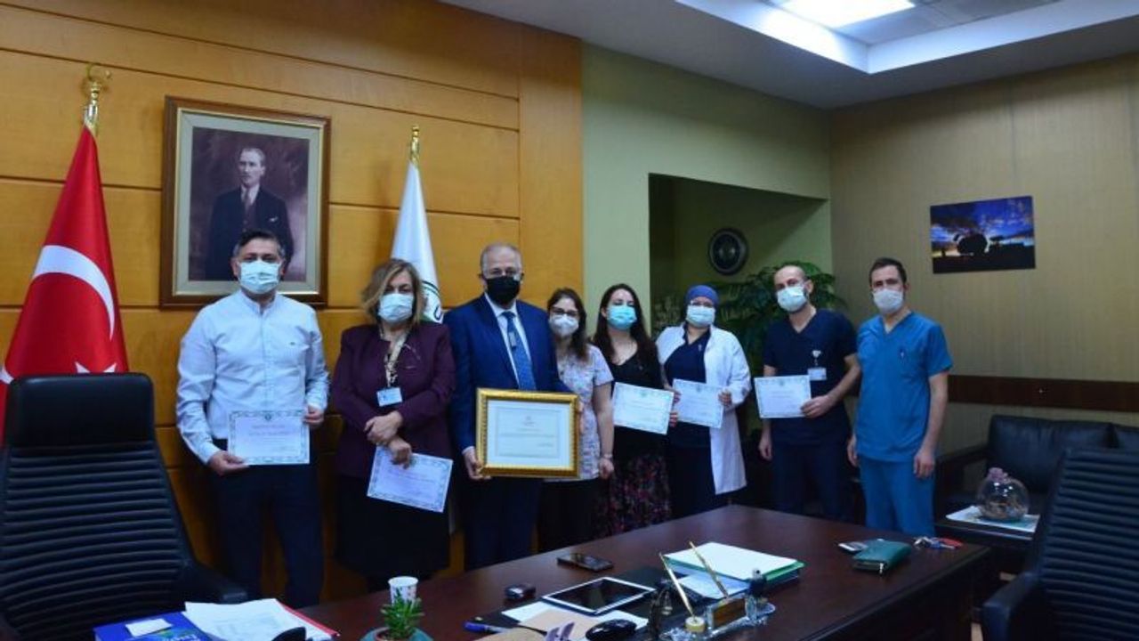 Kocaeli İl Sağlık Müdürü Yüksel Pehlevan tarafından Kocaeli Üniversitesi Hastanesi ‘ne Kocaeli İl Sağlık Müdürlüğü, Sağlık Bakanlığı ve Sağlık Hizmetleri Genel Müdürlüğü adına 2021 yıllı içerisinde organ bekleyen hastalara umut olan organ bağışı konusunda gösterilen gayret nedeni ile Kocaeli Üniversitesi Hastanesi Başhekimi Prof. Dr. Nuh Zafer Cantürk ‘e Teşekkür Belgesi takdim etti.