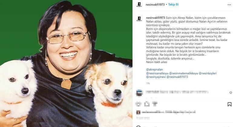 Akrep Nalan'ın ölüm haberinin ardından Aziz Nesin Vakfı'nın resmi Instagram hesabında başsağlığı mesajı yayınlandı. Ünlü sanatçının mirasını vakfa bağışladığı ortaya çıktı.