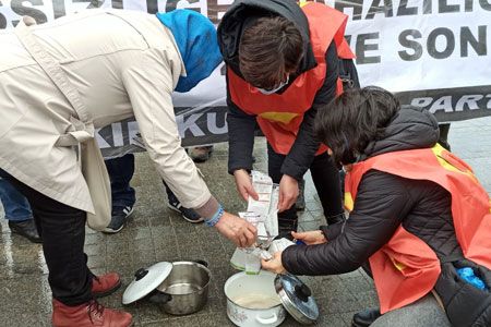 Kızıltaş’ın ardından söz alan HKP üyesi, “Şimdi 500, 1000, 1500 liraları bulan elektrik, doğalgaz, su faturalarımızı burada bu zamları protesto etmek için yakıyoruz” diye konuştu. HKP üyeleri, “Zam, zam, zam, ucuzluk ne zaman”, “Yapılan zamlar geri alınsın”, “Yapılan zamlar halka ihanettir” sloganları eşliğinde yanlarında getirdikleri faturaları yakarak zamların geri alınmasını talep etti. Zamları alkışlarla ve tencere çalarak protesto etti.