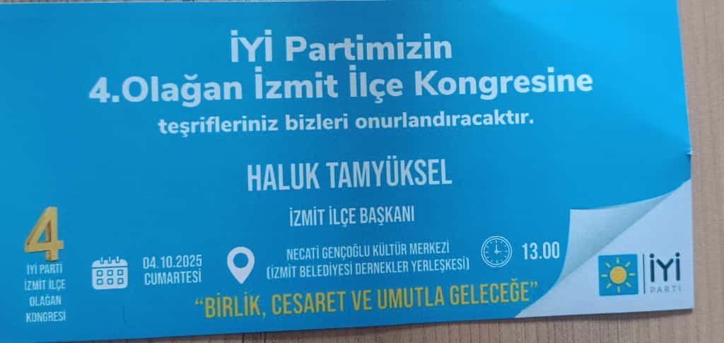 İYİ Parti İzmit İlçe Başkanlığı’nın 4. Olağan Kongresi, 4 Ekim Cumartesi günü saat 13.00’te Necati Gençoğlu Kültür Merkezi’nde gerçekleştirilecek. Haluk Tamyüksel, tüm vatandaşları kongreye davet ederek, “Bu kongre yalnızca bir  seçim değil, milletimizin yarınlarını aydınlatacak vizyonun buluşma noktasıdır. Birlik, cesaret ve umutla geleceğe yürüyoruz" ifadelerini kullandı.