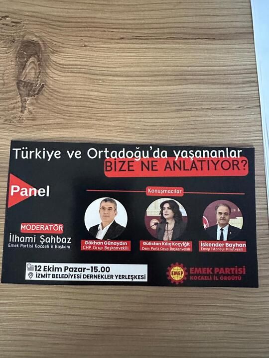 EMEK Partisi Kocaeli İl Başkanlığının “Türkiye ve Ortadoğu’da Yaşananlar Bize Ne Anlatıyor” konulu paneli 12 Ekim Pazar günü saat 15.00’de İzmit Dernekler Yerleşkesinde gerçekleşecek. Düzenlenecek olan panele Emek Partisi Kocaeli İl Başkanı İlhami Şahbaz, Genel Başkan Yardımcısı Arzu Erkan, CHP Grup Başkanvekili Gökhan Günaydın, Dem Parti Grup Başkanvekili Gülistan Kılıç Koçyiğit, Emep İstanbul Milletvekili İskender Bayhan katılım sağlayacak.