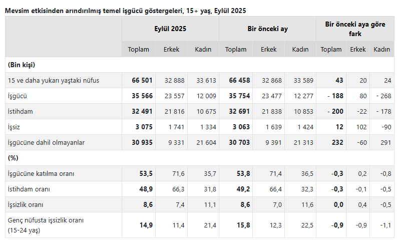 İşgücü, eylülde 188 bin kişi azaldı. Toplam işgücüne katılma oranı yüzde 53,5’e gerilerken; erkeklerde yüzde 71,6, kadınlarda yüzde 35,7 olarak kaydedildi.