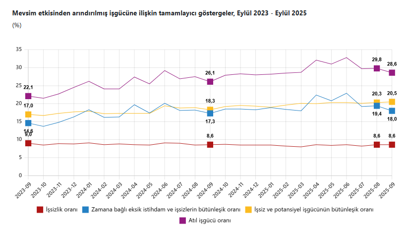 Zamana bağlı eksik istihdam, potansiyel işgücü ve işsizlerden oluşan atıl işgücü oranı eylülde yüzde 28,6’ya ulaştı. Bu oran, bir önceki aya göre 1,2 puanlık düşüş gösterse de, her dört kişiden birinin işgücü piyasasının dışında kaldığını ortaya koydu.