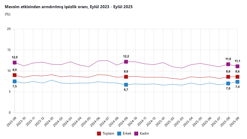 Eylül 2025’te işsiz sayısı 12 bin kişi artarak 3 milyon 75 bine ulaştı. İşsizlik oranı erkeklerde yüzde 7,4, kadınlarda ise yüzde 11,1 olarak tahmin edildi.