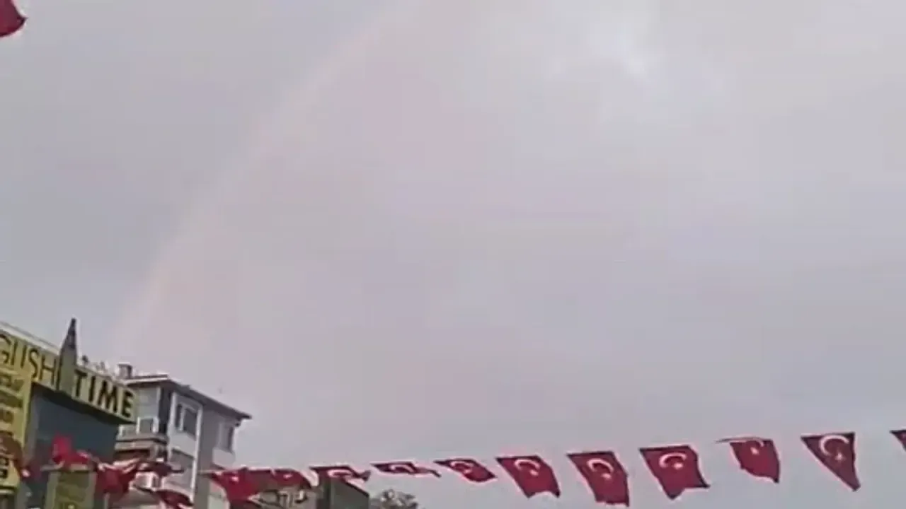 İzmit'te öğle saatlerinde etkili olan sağanak yağmurun ardından, gökyüzünde büyüleyici bir gökkuşağı oluştu. Kentin birçok noktasından net bir şekilde görülebilen renkli manzara, vatandaşlar tarafından cep telefonlarıyla görüntülendi.