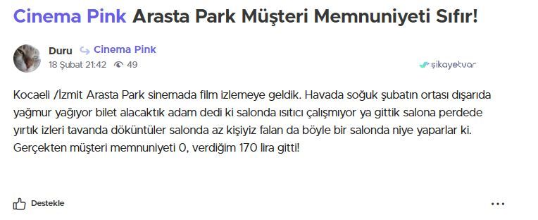 Salonun konfor şartlarının yetersizliği nedeniyle büyük mağduriyet yaşadıklarını Şikayetvar.com sitesi üzerinden dile getiren vatandaşlar, bilet için ödedikleri 170 TL’nin boşa gittiğini ve müşteri memnuniyetinin sıfır olduğunu ifade etti. Salonda bulunan izleyici sayısının az olmasına rağmen işletmenin gerekli bakımları yapmadığını belirten sinema severler, yetkililerden bir an önce çözüm beklediklerini dile getirdi.