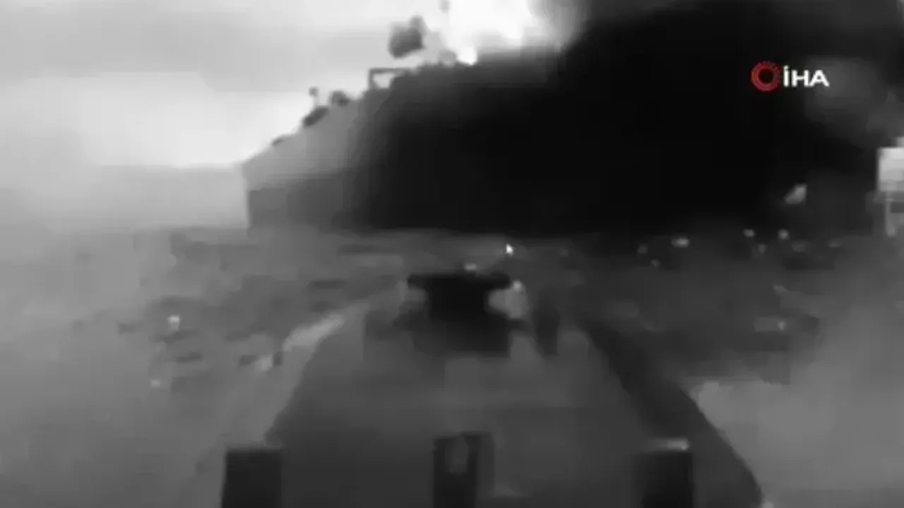 Kocaeli’nin Kandıra ilçesi açıklarında Karadeniz üzerinde seyir halindeyken vurulan yabancı menşeli geminin saldırıya uğradığı anlara ait görüntüler ortaya çıktı. O anlar, olay yerindeki bir dron kamerası tarafından saniye saniye kaydedildi. Görüntülerde gemiye isabet eden mühimmatın ardından büyük bir patlama yaşandığı, alevlerin yükseldiği ve siyah dumanın gökyüzüne yayıldığı görülüyor.