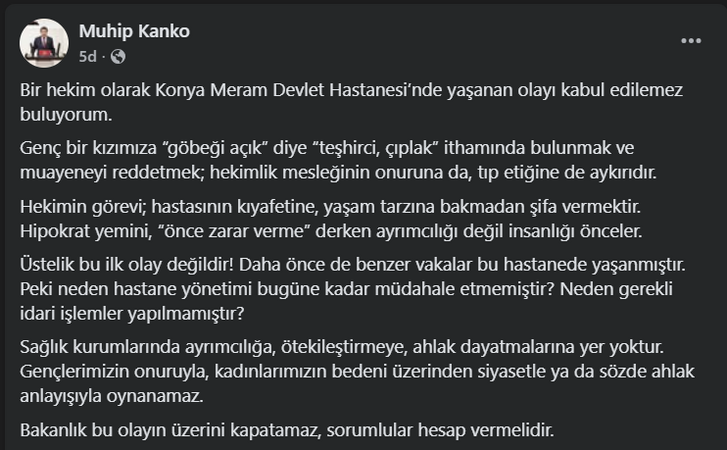 “Genç bir kızımıza ‘göbeği açık’ diye ‘teşhirci, çıplak’ ithamında bulunmak ve muayeneyi reddetmek; hekimlik mesleğinin onuruna da, tıp etiğine de aykırıdır. Hekimin görevi; hastasının kıyafetine, yaşam tarzına bakmadan şifa vermektir. Hipokrat yemini, ‘önce zarar verme’ derken ayrımcılığı değil insanlığı önceler.”