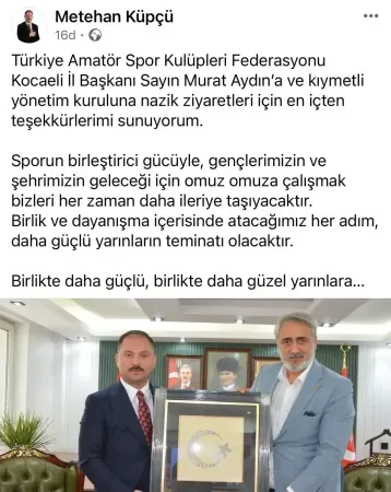 Ziyaretten duyduğu memnuniyeti dile getiren BBP Kocaeli İl Başkanı Metehan Küpçü, “Kocaeli Amatör Spor Kulüpleri Federasyonu Başkanı Sayın Murat Aydın’a ve kıymetli yönetim kuruluna nazik ziyaretleri için en içten teşekkürlerimi sunuyorum” diyerek sporun birleştirici gücüne dikkat çekti.