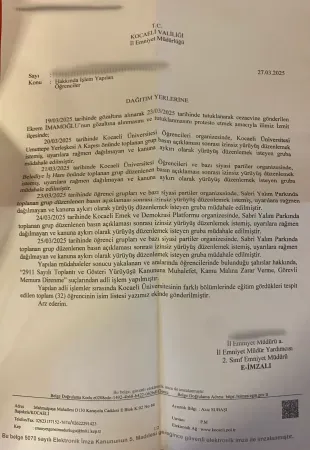 İstanbul Büyükşehir Belediye Başkanı Ekrem İmamoğlu’nun gözaltına alınmasının ardından Kocaeli'de yapılan protestolara katıldıkları gerekçesiyle gözaltına alınan Kocaeli Üniversitesi öğrencilerine disiplin soruşturması açıldı. Emniyetin gönderdiği resmi yazının ardından üniversite yönetimi 32 öğrenci hakkında işlem başlattı.