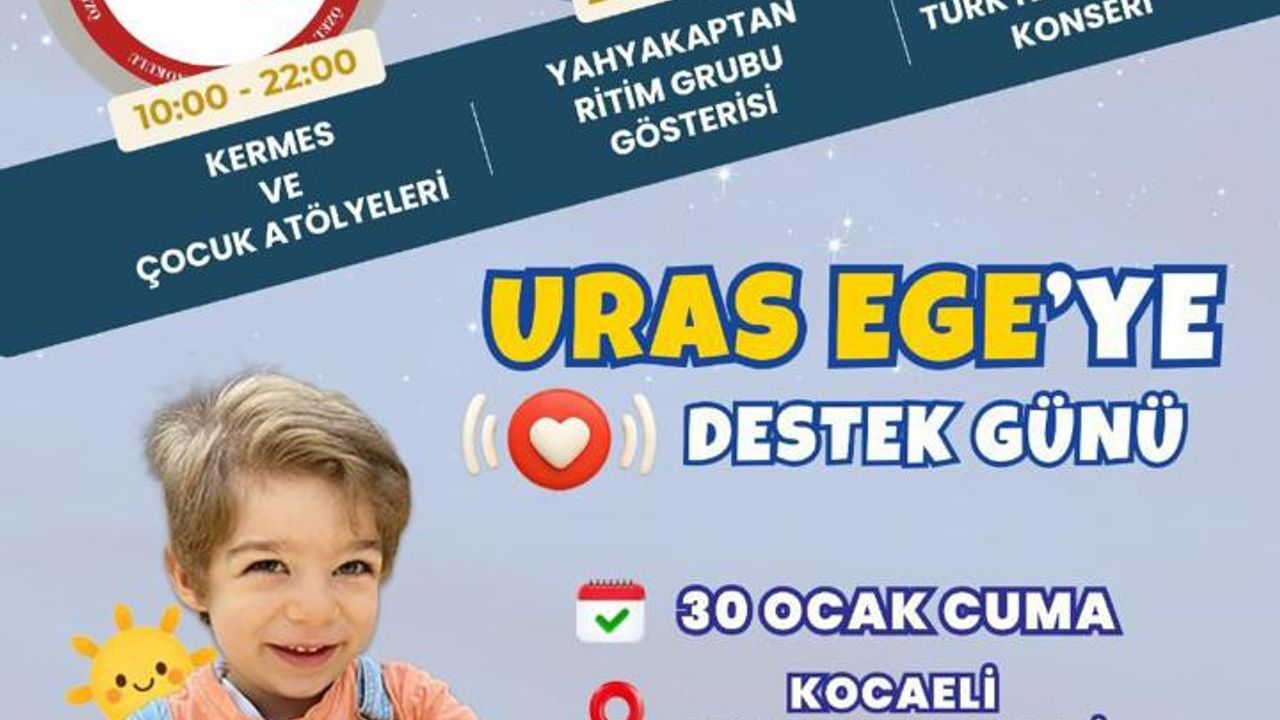 Duchenne Musküler Distrofi (DMD) hastası Uras Ege’nin sağlığına kavuşması amacıyla Kocaeli’de sürdürülen yardım kampanyası final aşamasına geldi. Kampanyanın tamamlanması için Özel İzmit Kalbim Anaokulu ile Yahya Kaptan Mahalle Muhtarlığı iş birliğinde geniş katılımlı bir dayanışma günü planlandı. Etkinlik, 30 Ocak Cuma günü Kocaeli Kongre Merkezi’nde saat 10.00’da başlayacak ve 23.00’e kadar sürecek. Gün boyunca elde edilecek tüm gelir, Uras Ege’nin tedavi masraflarında kullanılacak.