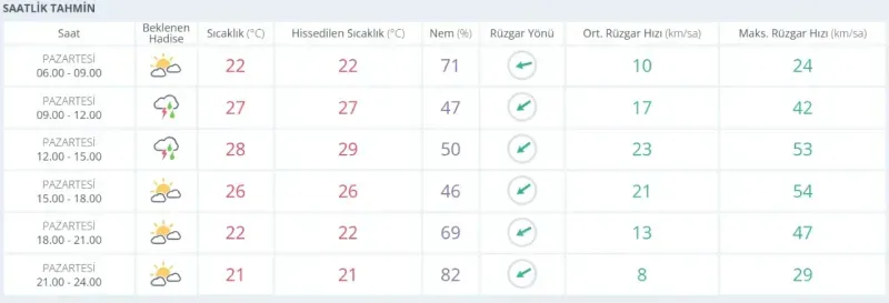 Sabah saatlerinde parçalı bulutlu bir hava hakim olurken, 09.00’dan itibaren gök gürültülü sağanak yağışların başlayacağı tahmin ediliyor. 12.00 – 15.00 aralığında ise yağışın şiddetini artırarak kuvvetli sağanak halinde etkili olması öngörülüyor.