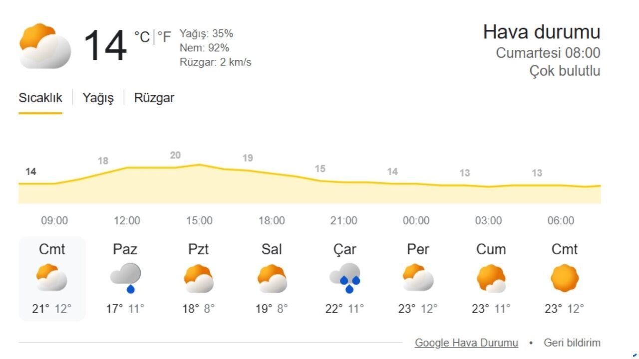 Cumartesi günü sabah saatlerinde dışarı çıkmayı planlayanların şemsiye bulundurması öneriliyor. Öğle saatlerinden itibaren havanın açmasıyla birlikte açık hava etkinlikleri için uygun bir ortam oluşacak.