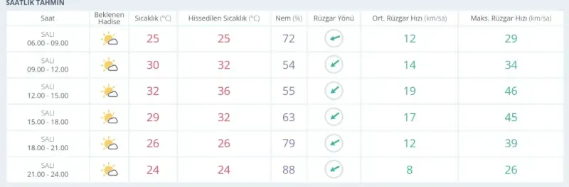 Özellikle öğle saatlerinde rüzgarın etkisi artarak 46 km/saat’e kadar çıkması bekleniyor. Gün boyunca nemin %55-88 arasında değişmesi, sıcak havanın daha da bunaltıcı hissedilmesine yol açacak.