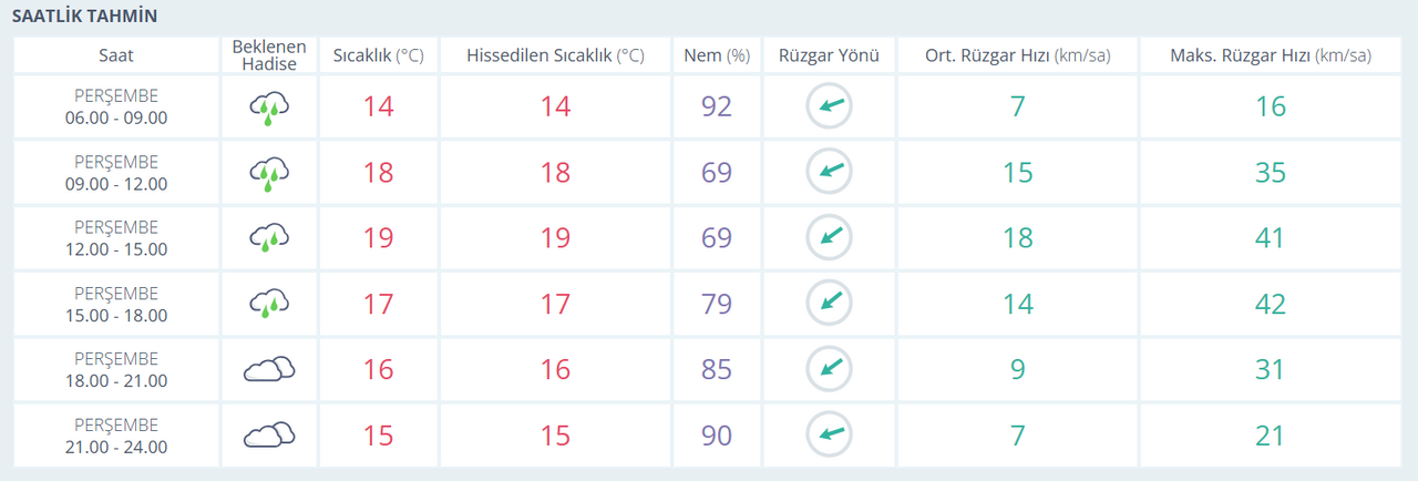 15.00 - 18.00 arası: Hafif sağanak yağışlı, sıcaklık 17 derece. Rüzgâr 14 km/sa, maksimum 42 km/sa.