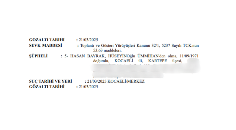 Ekrem İmamoğlu’nun diplomasının iptali ve gözaltına alınması kararının ardından Kocaeli’de protesto gösterileri düzenlenmişti. Bu gösterilere katılan CHP’li Körfez Belediyesi Meclis Üyesi Ali Doğan ile CHP Kartepe İlçe Başkanı Hasan Bayrak gözaltına alınmıştı.