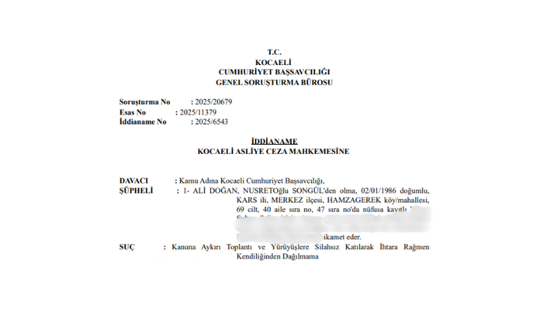 Kocaeli Cumhuriyet Başsavcılığı tarafından hazırlanan iddianamede, Doğan ve Bayrak hakkında “Toplantı ve Gösteri Yürüyüşleri Kanunu’na muhalefet” suçlaması yöneltildi. İddianamede, iki ismin de “kanuna aykırı toplantı ve yürüyüşe silahsız katılmak, ihtara rağmen kendiliğinden dağılmamak” suçlarını işlediği iddia edildi.