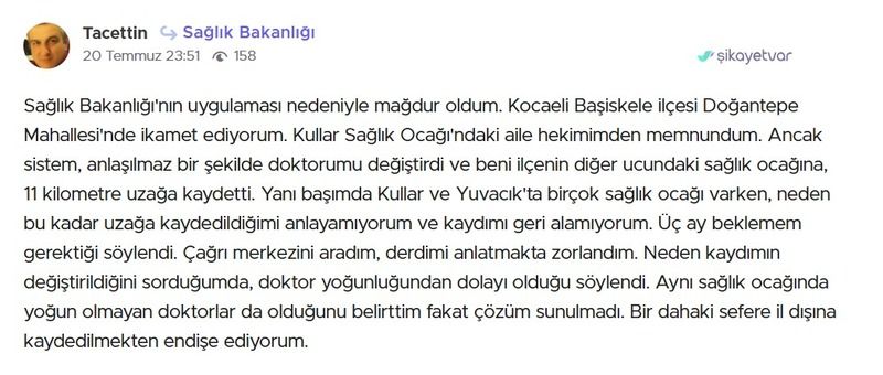 Yaşadığı sorunu dile getiren vatandaş platformda yaptığı paylaşımda şu ifadeleri kullandı: “Sağlık Bakanlığı'nın uygulaması nedeniyle mağdur oldum. Kocaeli Başiskele ilçesi Doğantepe Mahallesi'nde ikamet ediyorum. Kullar Sağlık Ocağı'ndaki aile hekimimden memnundum. Ancak sistem, anlaşılmaz bir şekilde doktorumu değiştirdi ve beni ilçenin diğer ucundaki sağlık ocağına, 11 kilometre uzağa kaydetti. Yanı başımda Kullar ve Yuvacık'ta birçok sağlık ocağı varken, neden bu kadar uzağa kaydedildiğimi anlayamıyorum ve kaydımı geri alamıyorum.