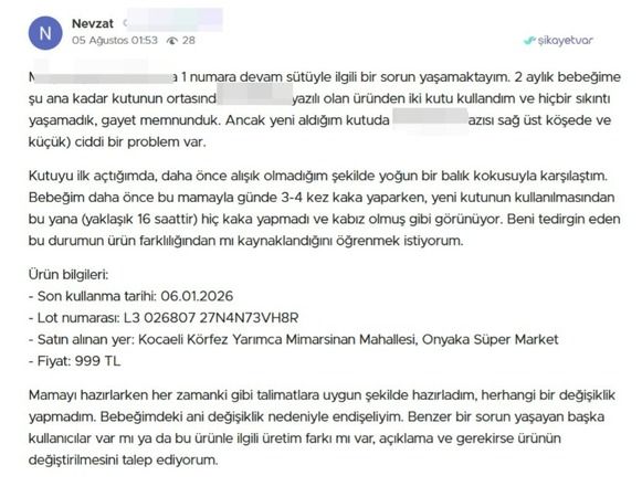 Vatandaş, “Önceki kutularda herhangi bir sorun yaşamamıştık, ancak yeni aldığımız kutuyu açar açmaz yoğun bir balık kokusu fark ettim” diyerek tepkisini dile getirdi. Aynı mama ile bebeğin günlük 3-4 kez dışkı yaptığını ancak yeni ürünle birlikte 16 saat boyunca tuvaletini yapmadığını belirten vatandaş bebeğinin sağlığıyla ilgili endişe ettiğini ifade etti.