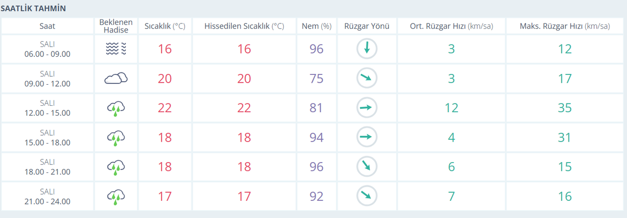 Saat 09.00’dan itibaren çok bulutlu hava bekleniyor. Sıcaklık 20°C’ye kadar yükselirken, nem oranı %75’e düşecek. Rüzgar hızında da hafif bir artış öngörülüyor. Meteorolojik verilere göre, 12.00–15.00 saatleri arasında sağanak yağış başlayacak. Bu saatlerde sıcaklık 22°C’ye ulaşırken, nem oranı tekrar %81 seviyesine yükselecek. Rüzgar ise saatte 35 km hıza kadar çıkabilir. 15.00’ten itibaren sıcaklık 18°C’ye düşerken, yağışların devam etmesi bekleniyor. 18.00–24.00 saatleri arasında ise sağanak yağışların aralıklarla süreceği, nem oranının %92–96 aralığında seyredeceği tahmin ediliyor. Rüzgarın hızının ise 15–16 km/s seviyelerinde olacağı bildirildi.