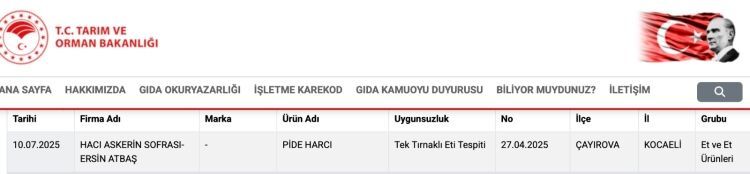 Tarım ve Orman Bakanlığı, taklit ve tağşiş yapılan ürünlere karşı yürüttüğü denetim çalışmalarında yeni bir skandalı daha ortaya çıkardı. 10 Temmuz 2025 tarihinde güncellenen listeye göre, Kocaeli’nin Çayırova ilçesinde faaliyet gösteren “Hacı Askerin Sofrası” adlı işletmenin pide harcında, insan sağlığı açısından son derece riskli olan tek tırnaklı hayvan etine rastlandı.