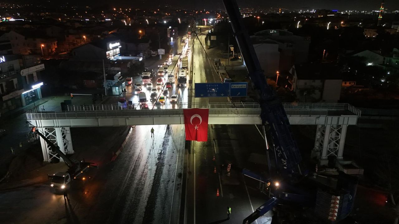 Kocaeli Büyükşehir Belediyesi tarafından yürütülen projede ekipler, çalışmaları hız kesmeden sürdürüyor. Kasap Durağı mevkiinde yer alan yaya üst geçidinin tabliye montajı, gece saatlerinde yapılan çalışma ile tamamlandı. Bu süreçte D-130 Karayolu’nun İzmit ve Gölcük istikametleri geçici olarak trafiğe kapatıldı.