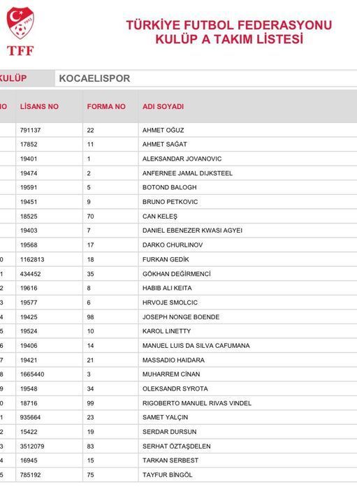 Önceden hazırlanan listede yer alan genç futbolcu Mustafa Ege Bilim ise kadrodan çıkartıldı. Böylece Ahmet Sağat’ın yeniden takıma dahil edilmesiyle Kocaelispor’un lig kadrosu son halini aldı.