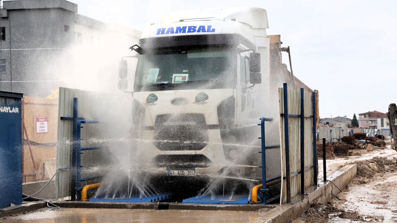 Şantiye sahalarına yerleştirilen özel sistem sayesinde hafriyat kamyonları ve iş makineleri, ana yollara çıkmadan önce yüksek basınçlı suyla yıkanıyor. Tekerlek ve kasa bölümlerinde biriken çamur ile toz, bu işlemle temizleniyor.