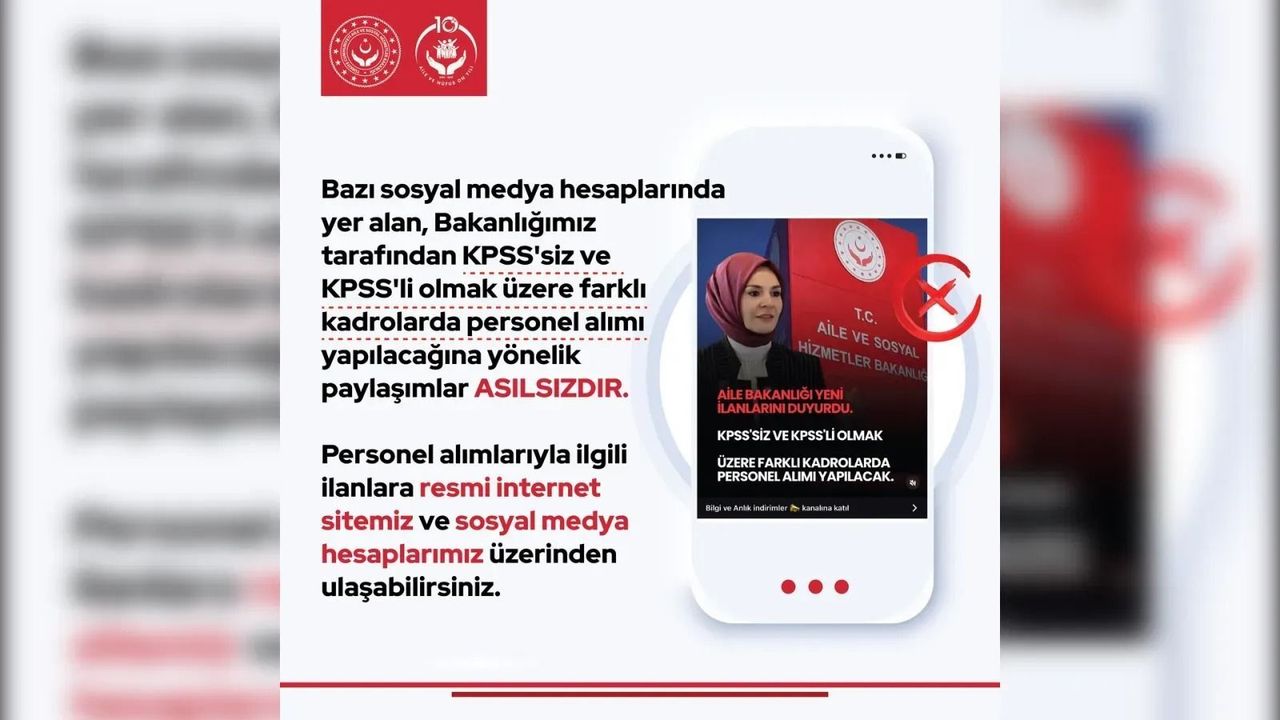 Bakanlık, söz konusu paylaşımların asılsız olduğunu belirterek kamuoyunu uyardı. Yapılan açıklamada, “Bazı sosyal medya hesaplarında yer alan, Bakanlığımız tarafından KPSS’siz ve KPSS’li olmak üzere farklı kadrolarda personel alımı yapılacağına yönelik paylaşımlar asılsızdır.” ifadelerine yer verildi.