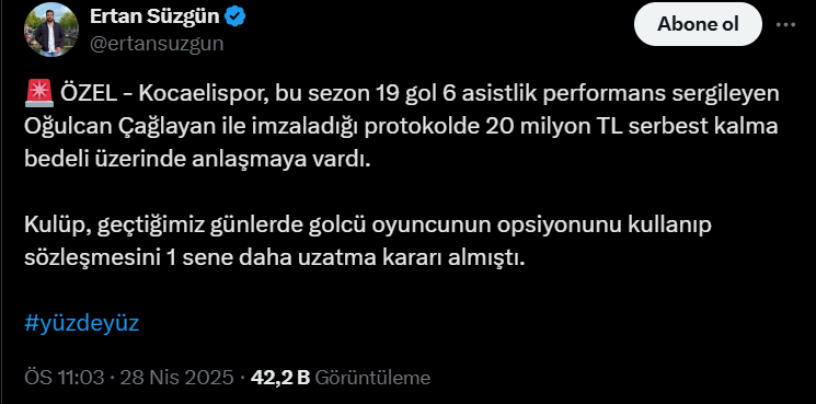 Bu sezon Kocaelispor formasıyla 19 gol ve 6 asistlik üstün bir performans sergileyen Oğulcan Çağlayan için kulüp yönetimi önemli bir karar aldı. Spor muhabiri Ertan Süzgün’ün özel haberine göre, Kocaelispor ile Oğulcan arasında yapılan protokole 20 milyon TL tutarında bir serbest kalma bedeli maddesi eklendi.