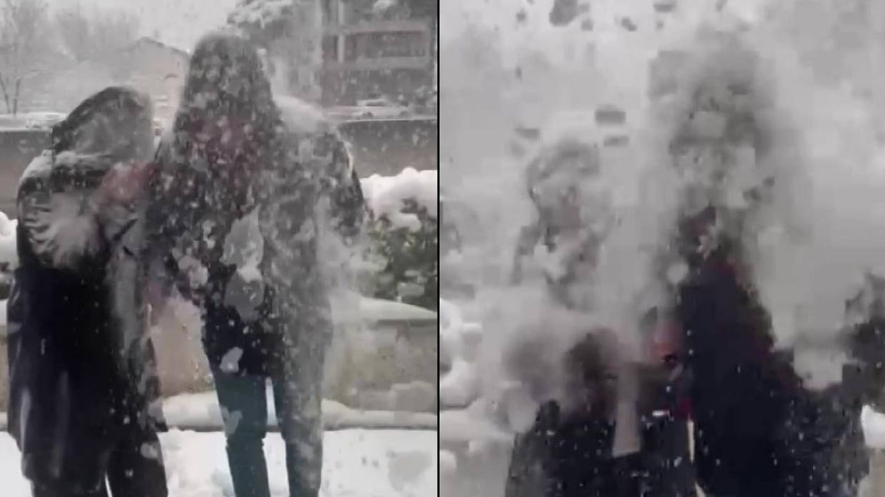 Kentteki bir otelin bahçesinde dolaşan Öztürk çifti, yağış sonrası üstünde kar biriken tentenin altına geçip yavaş yavaş dökülmesini bekledikleri karlarla selfie yapmayı planladı. Görevlilerin çabasıyla hareketlenen kar kütlesinin bir anda döküldüğü çift hayatlarının en soğuk şokunu yaşadı, üstleri beyaza büründü.