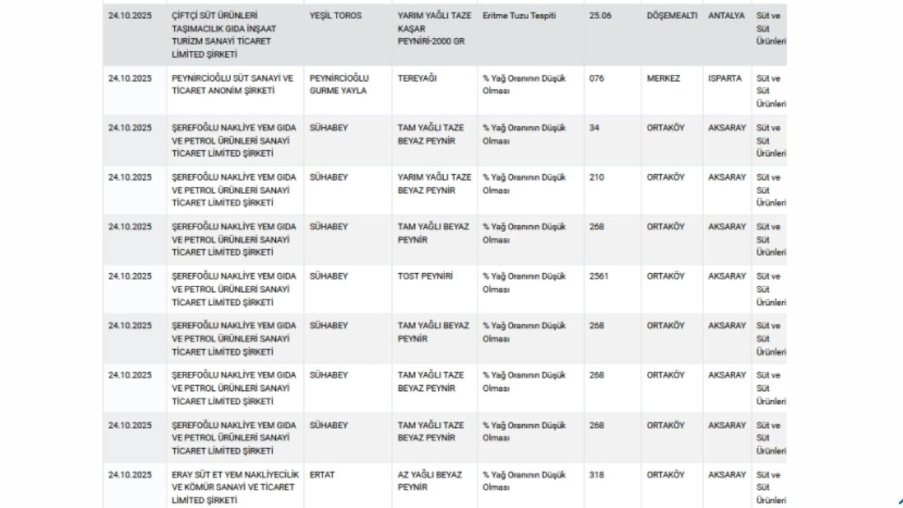 Ayrıca bazı peynirlerde eritme tuzu kullanıldığı da raporlara yansıdı.