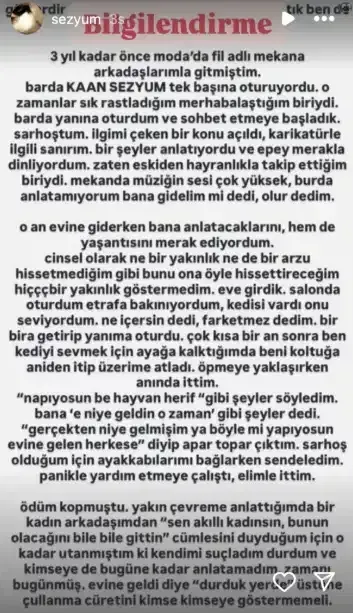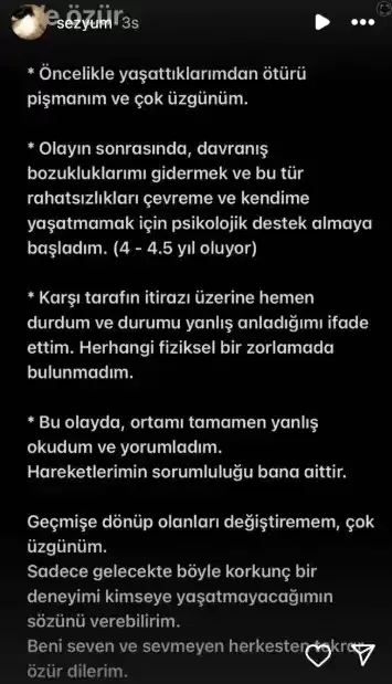 “Öncelikle yaşattıklarımdan ötürü pişmanım ve çok üzgünüm” diyen Sezyum, davranış bozuklukları nedeniyle psikolojik destek almaya başladığını belirtti. Taciz olayında “ortamı yanlış okuduğunu” ifade eden Sezyum, geçmişi değiştiremeyeceğini ancak aynı hatayı tekrarlamayacağının sözünü verdi.